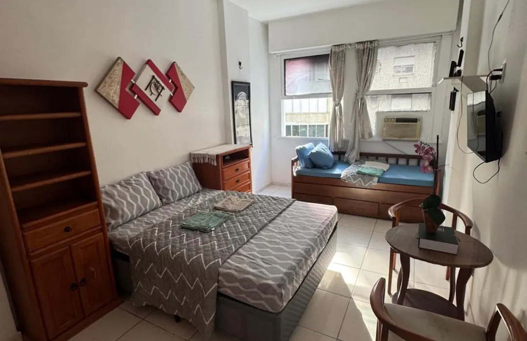 The apartment is located in Copacabana, known as Princess of the Sea, about 10 minutes by car from Botafogo Praia Shopping. The 35 m² property is at walking distance from Avenida Atlantica Street in Rio de Janeiro.